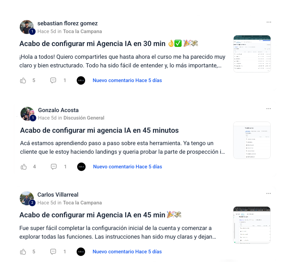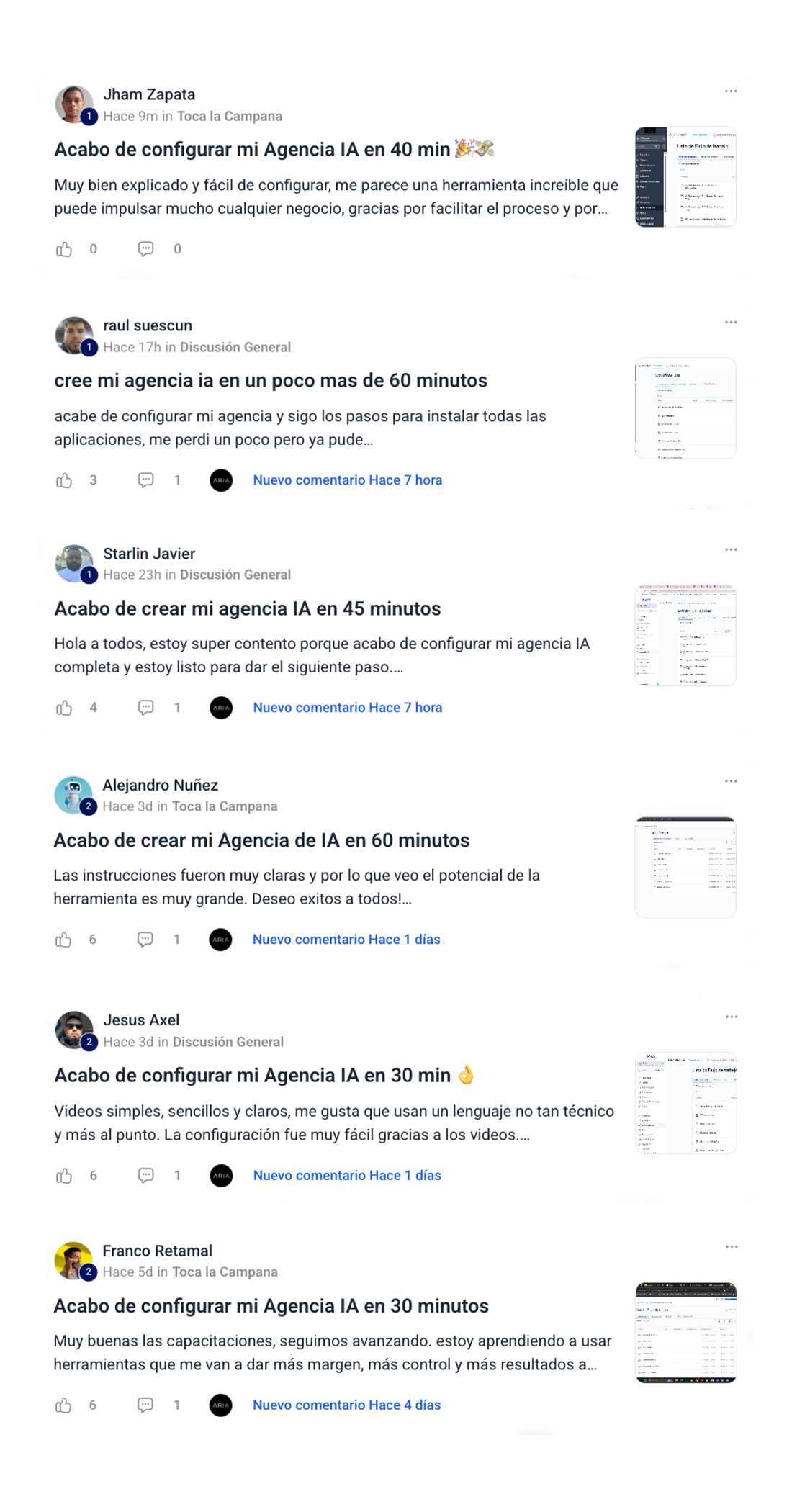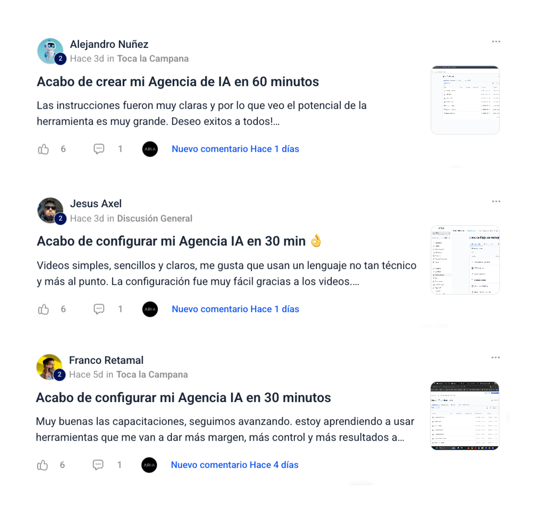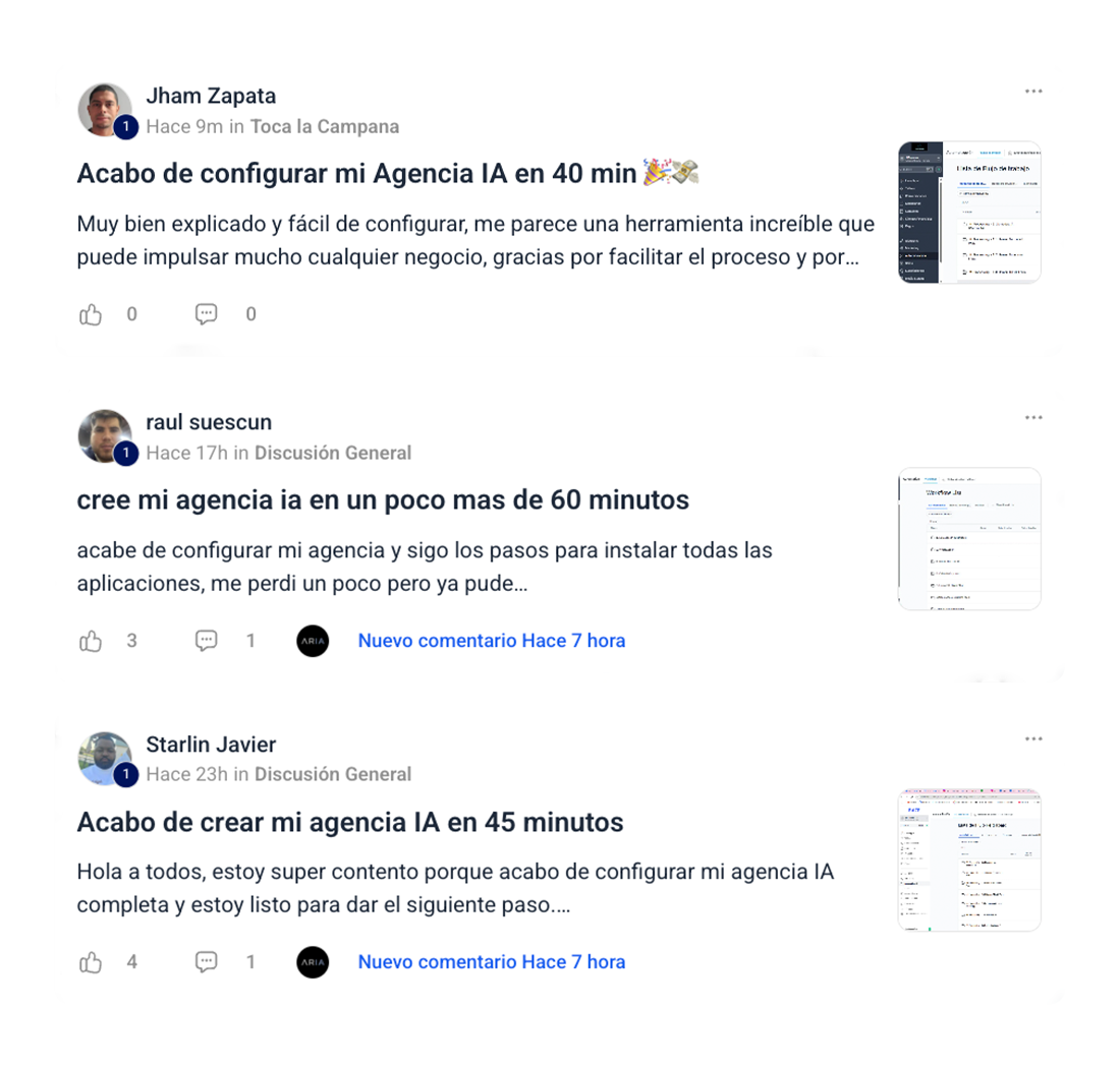 Y esa claridad te la damos con nuestros casos de éxito: personas reales que, como tú, comenzaron desde cero y hoy ya tienen su agencia de IA activa y vendiendo con sus propios agentes.
